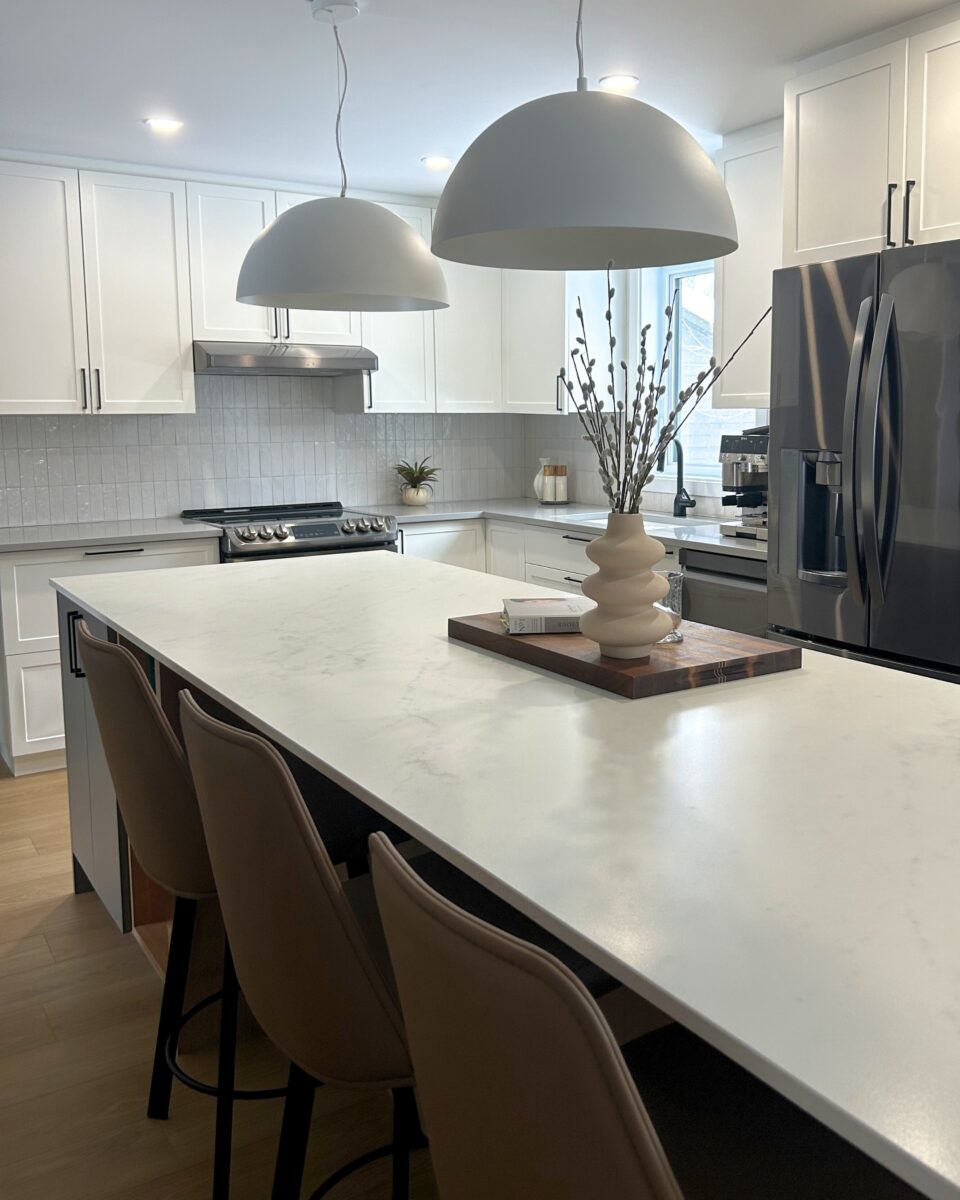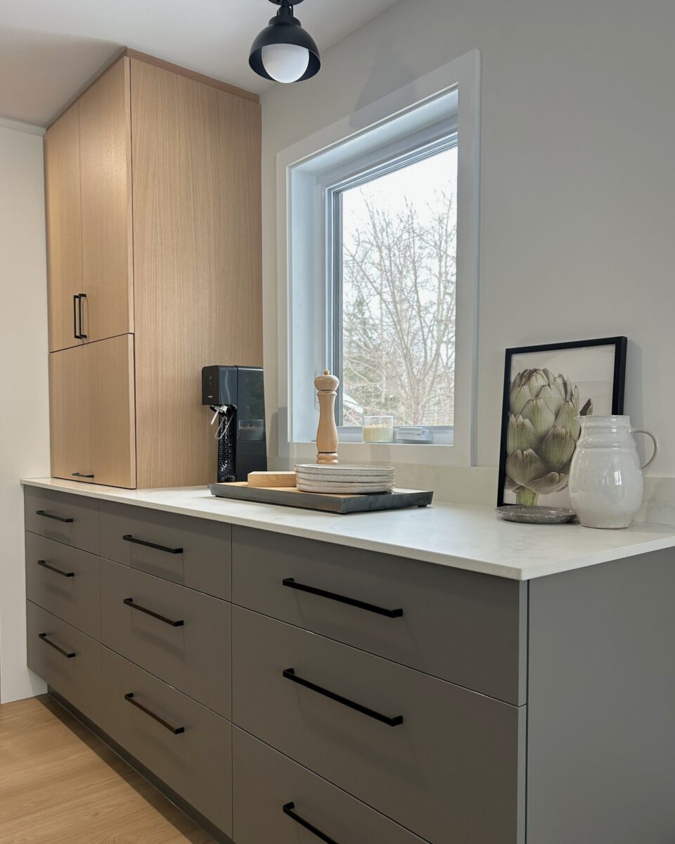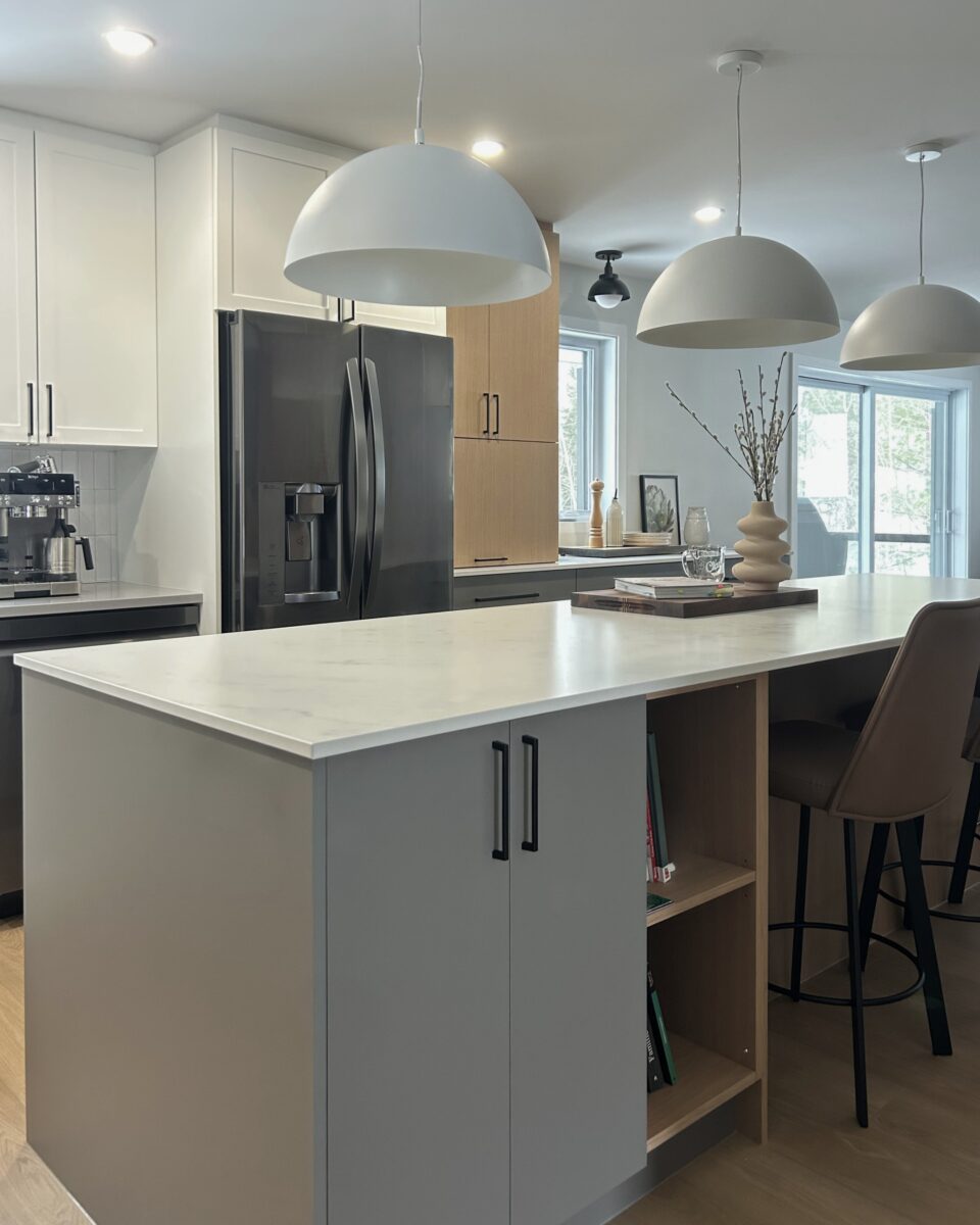 La cuisine faisait déjà partie de la maison, mais l’agrandissement a ouvert la porte à un tout nouveau potentiel. En repensant l’espace, nous avons pu intégrer un grand îlot central et un back kitchen optimisé, agrandir les caissons et harmoniser l’ensemble afin de créer une cuisine lumineuse, fonctionnelle et parfaitement adaptée au mode de vie des propriétaires.